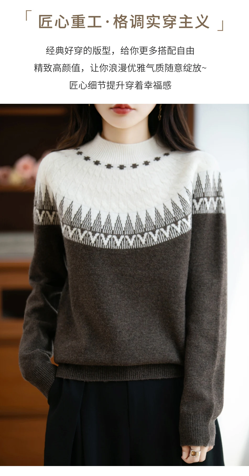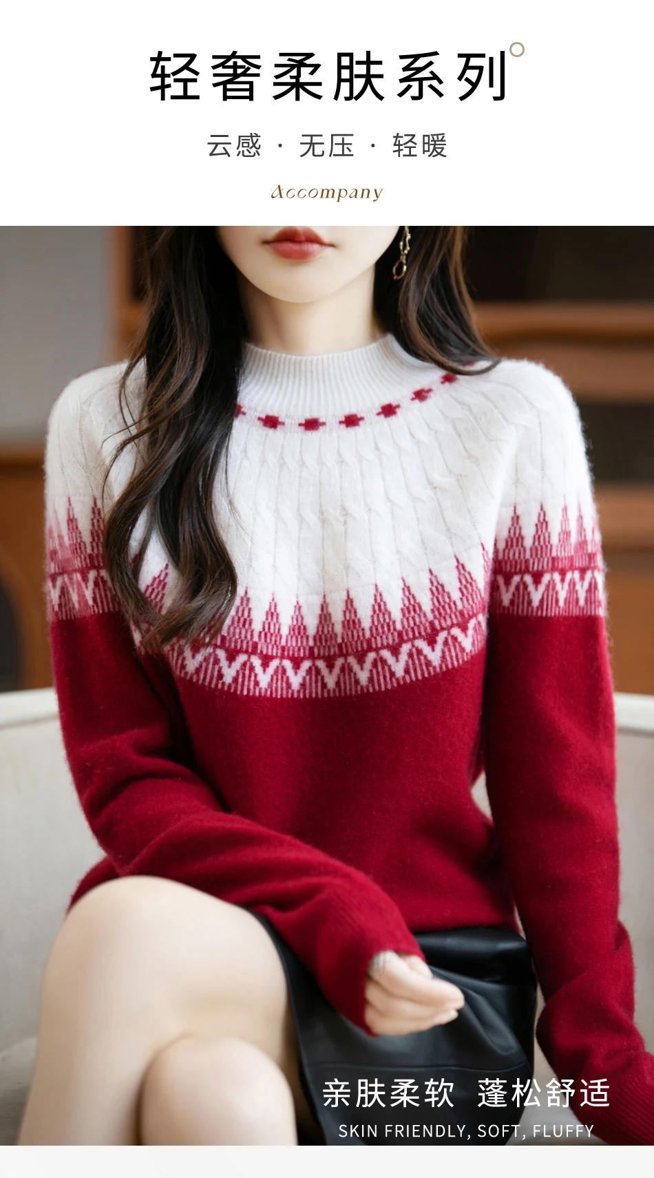 Autumn/Winter New Half High Neck Sweater 100% Wool Knitted Vintage Look. Loose Fit Christmas Red Sweaters Chic Streetwear for Women