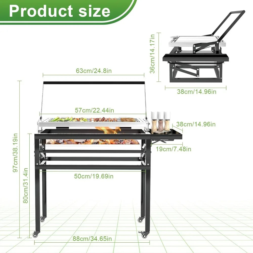 This BBQ charcoal grill is equipped with a 360-degree rotatable grilling basket, allowing for even cooking by simply turning the handle. This feature not only conserves time and effort but also minimizes the risk of burns from handling hot food or grilling tools. The outdoor camping grill offers adjustable tray heights with five different settings, providing precise control over cooking temperatures and ensuring that various foods are cooked to your preference without the risk of overcooking or undercooking. The grill is designed for portability with detachable legs that can be easily removed, making it ideal for outdoor grilling. The convenience of this design allows for quick disassembly and storage, enabling you to enjoy grilled delicacies at any location without being confined to a single spot. Additionally, the grill includes a convenient side storage compartment for keeping grilling sauces and condiments within easy reach, enhancing the grilling experience by allowing for quick flavor enhancements without interruptions. The grill's robust construction is highlighted by its carbon steel grilling rack and stainless steel charcoal tray, chosen for their durability and ability to withstand high temperatures and frequent use, making it a reliable choice for outdoor grilling enthusiasts.
