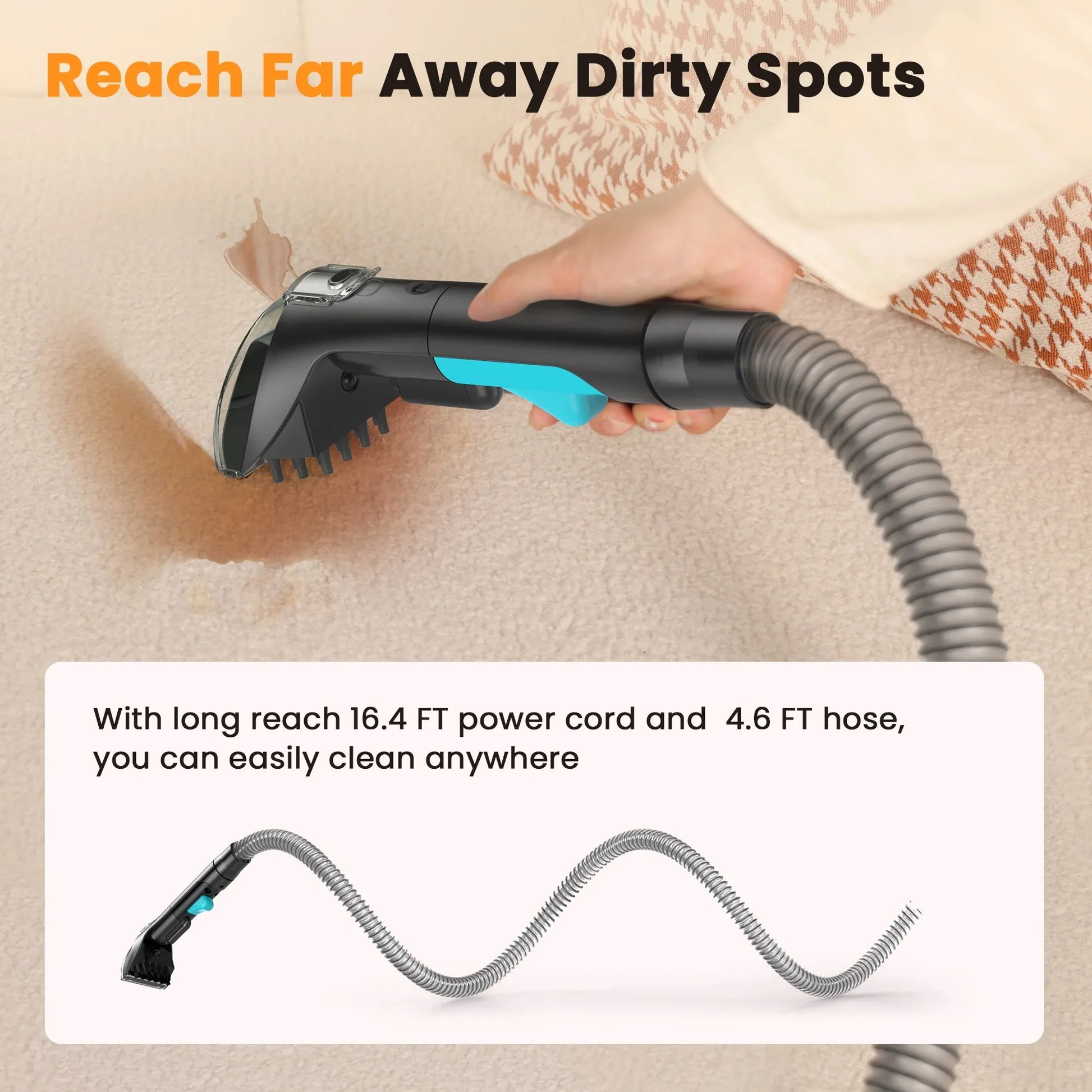 Package Size: 440 × 280 × 390 mm[Powerful Suction] Deep cleans up to 1.96 inches below carpet.[Lightweight] Only 9 lbs, easy to carry and store.[Long Reach] 16.4 FT cord and 4.6 FT hose with two brushes.[Quiet Operation] Ergonomic and easy to use.[Dual Tanks] Separate clean and dirty water tanks.[Simple Maintenance] Removable tanks for easy cleaning
